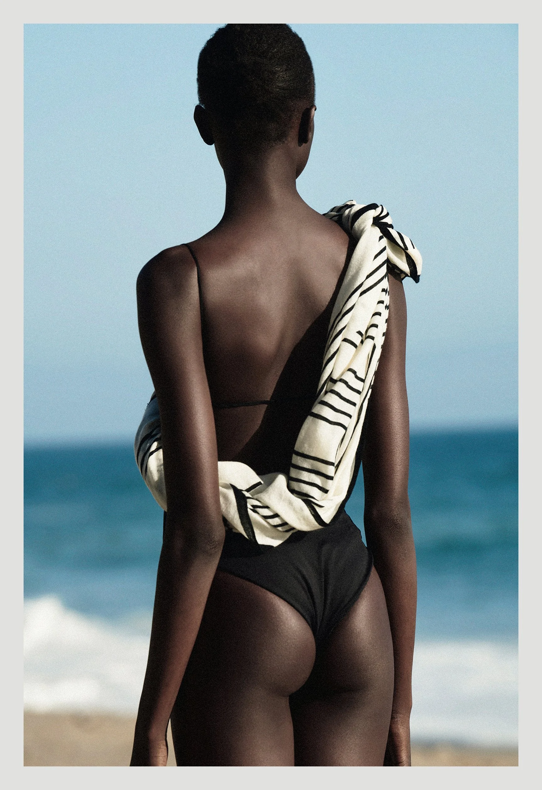 Back view of a woman with short hair, wearing black swimwear with thin straps, standing on the beach with ocean waves in the background, and a striped cover-up draped over her shoulder.